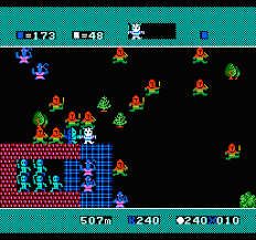 Essa é a visão poética do manual do jogo. Basicamente, você e um boneco feio que deve andar 597 metros libertando seus soldados presos em pedras e árvores (que ajudarão você no combate) tentando evitar inimigos que bloqueiam seu caminho. Não, eles não atacam, eles tentam bloquear o caminho de modo que você seja forçado a encostar neles, onde começa uma batalha com destino aleatório, sendo que na maioria das vezes você morre. Abaixo, uma cena de guerra e a tela de game over.