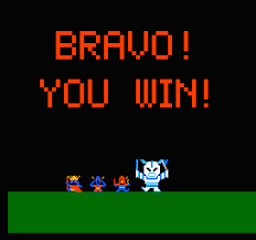Agora, aos detalhes mais técnicos e à conclusão. Os gráficos, como pode ser evidenciado pelas fotos são bastante primitivos, mas até aceitáveis para um jogo de 1985. A música é um som chato que se repete a cada 15 segundos. E a jogabilidade é muito, mas muito falha, com combates aleatórios que não raramente resultam em derrota e game over, tendo que reinciar tudo de novo mais uma vez (que redundância, Cristo!). Os aliados são um detalhe interessante, algo vagamente positivo em relação ao game, já que eles atacam os inimigos, morrendo no seu lugar. E então, abaixo, a tela final, mostrada para heróis como eu que completaram essa coisa, derrotando King Ogreth \o/